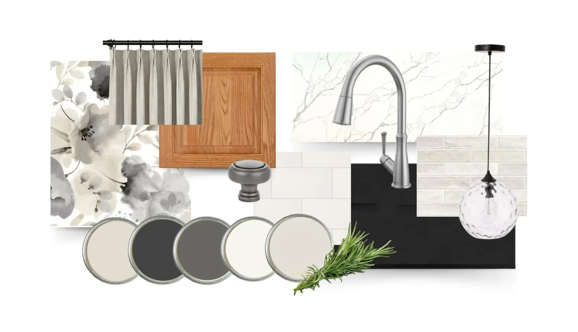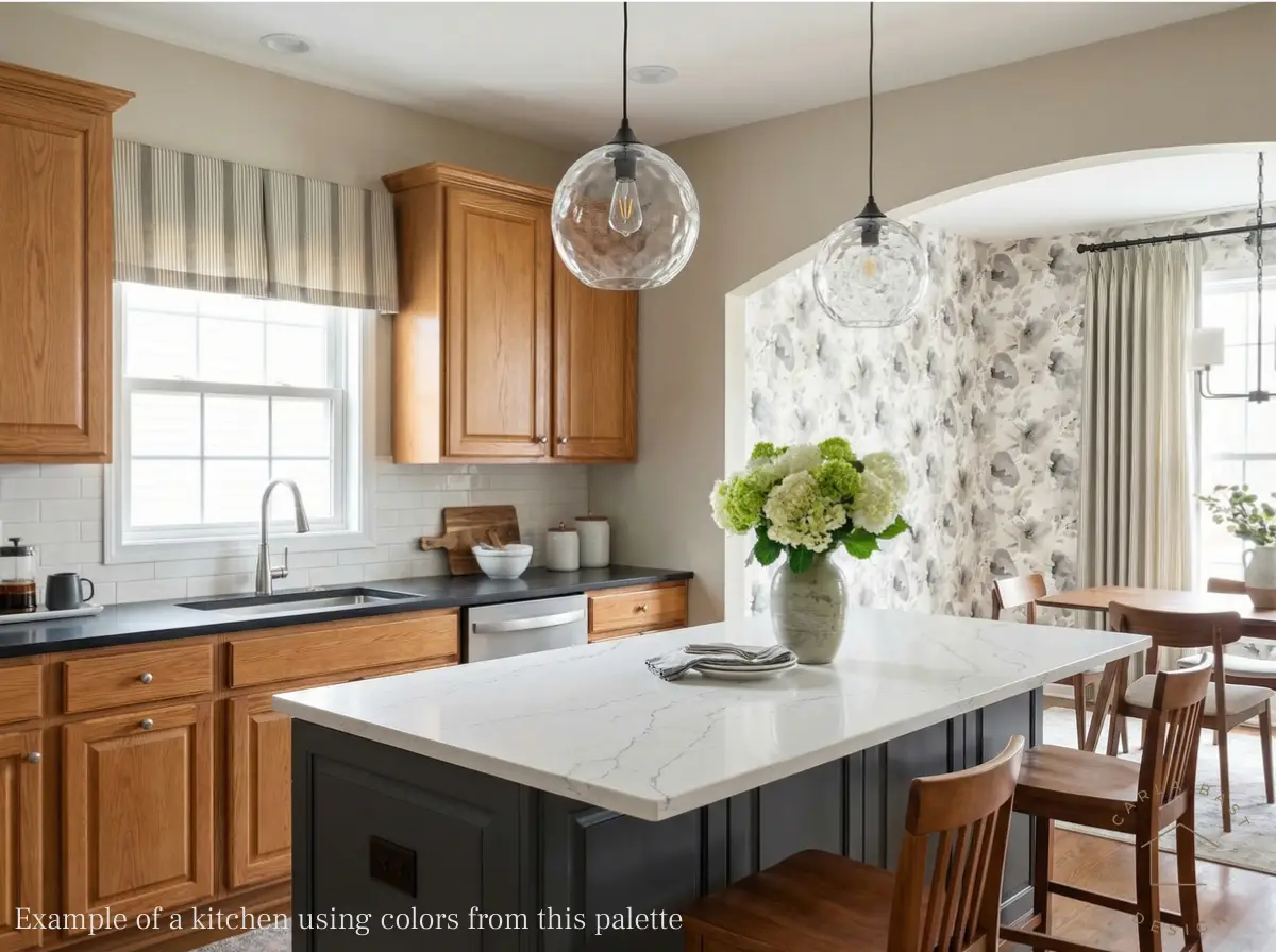 Refresh your oak kitchen with this designer-curated Kitchen Refresh Plan. Palette No. 3 is centered around a sophisticated blend of warm grays, creamy whites, and soft beiges that beautifully complement the golden undertones of honey oak cabinetry. The result is a kitchen that feels softened, modernized, and effortlessly timeless.