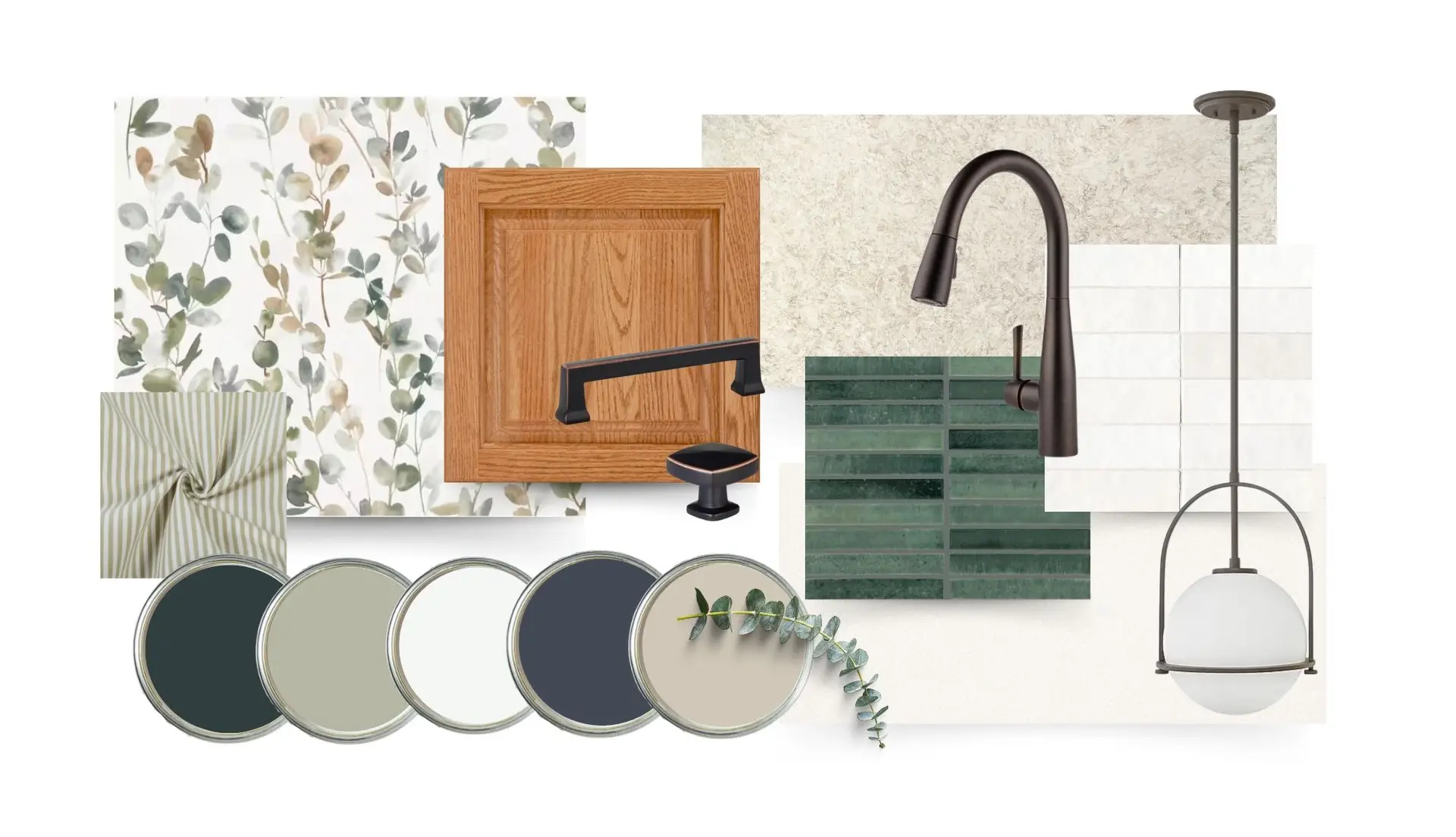 Honey Oak Kitchen Design Palette No. 5 is designed to bring balance, warmth, and sophistication to an oak kitchen. The look is grounded in soft neutrals and layered with rich, moody accents for just the right amount of contrast. A highlight of this palette is the nature-inspired wallpaper, featuring a graceful toss of olive and brown leaves that ties everything together with organic elegance. Light surfaces and crisp whites keep the design fresh and airy, while deeper accent tones add drama and personality.